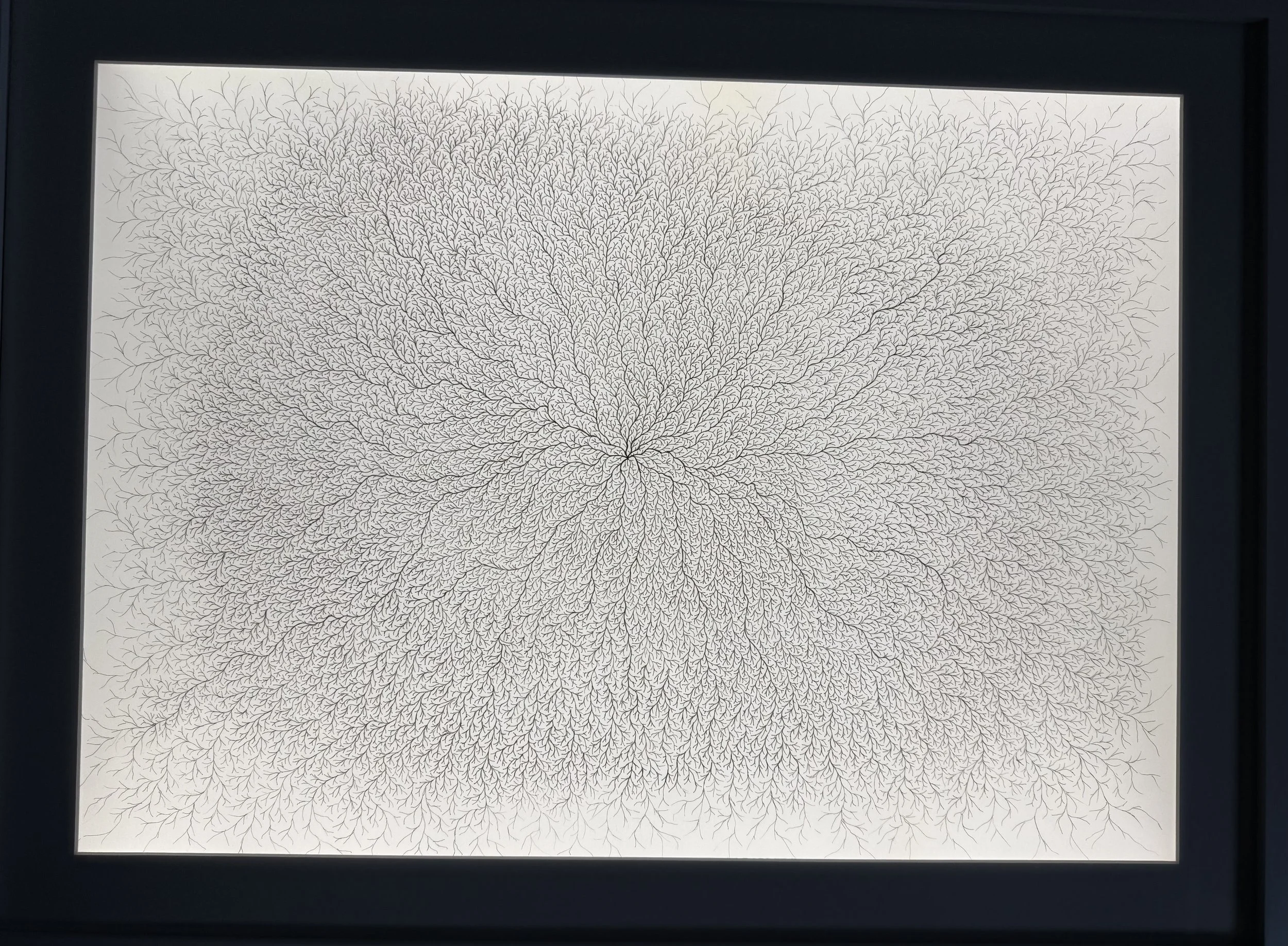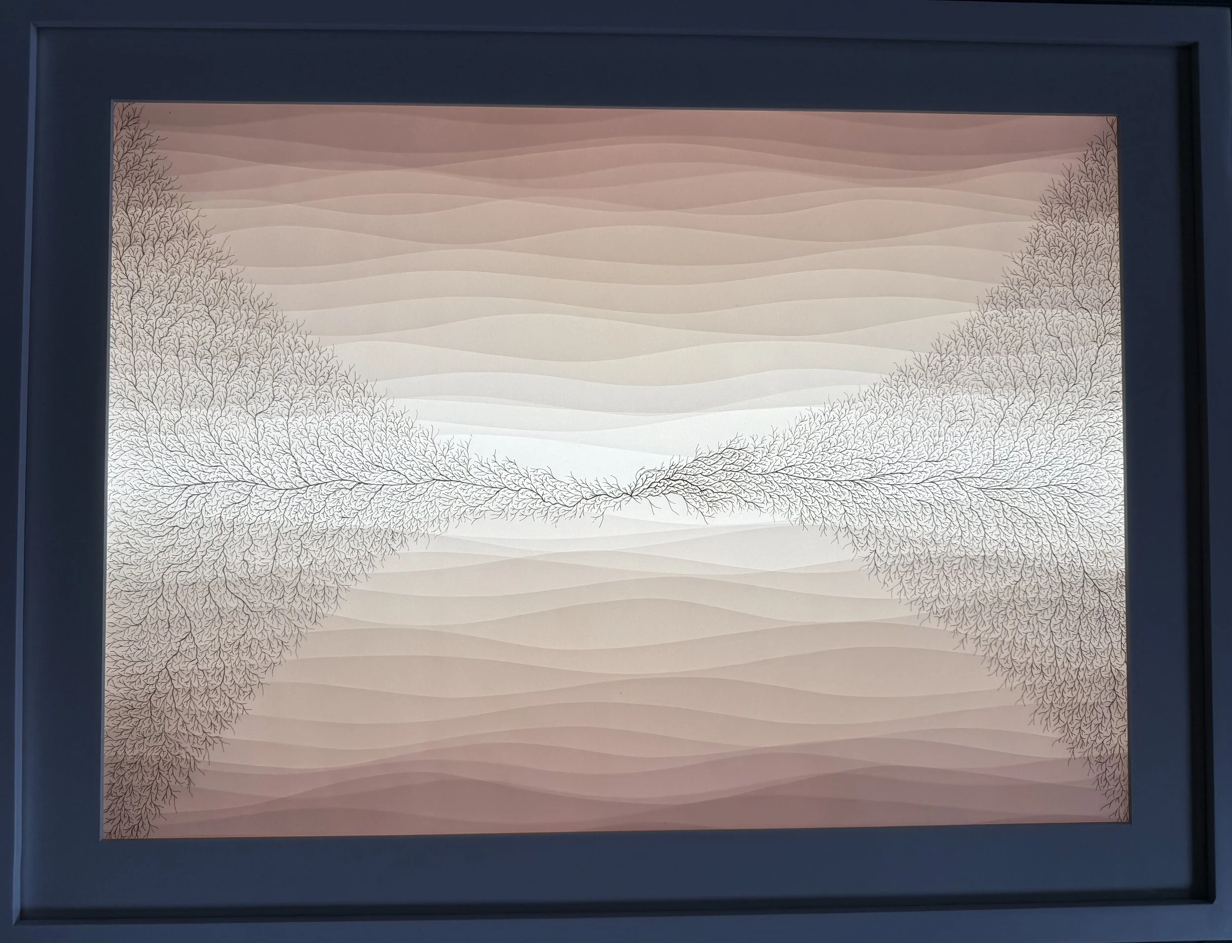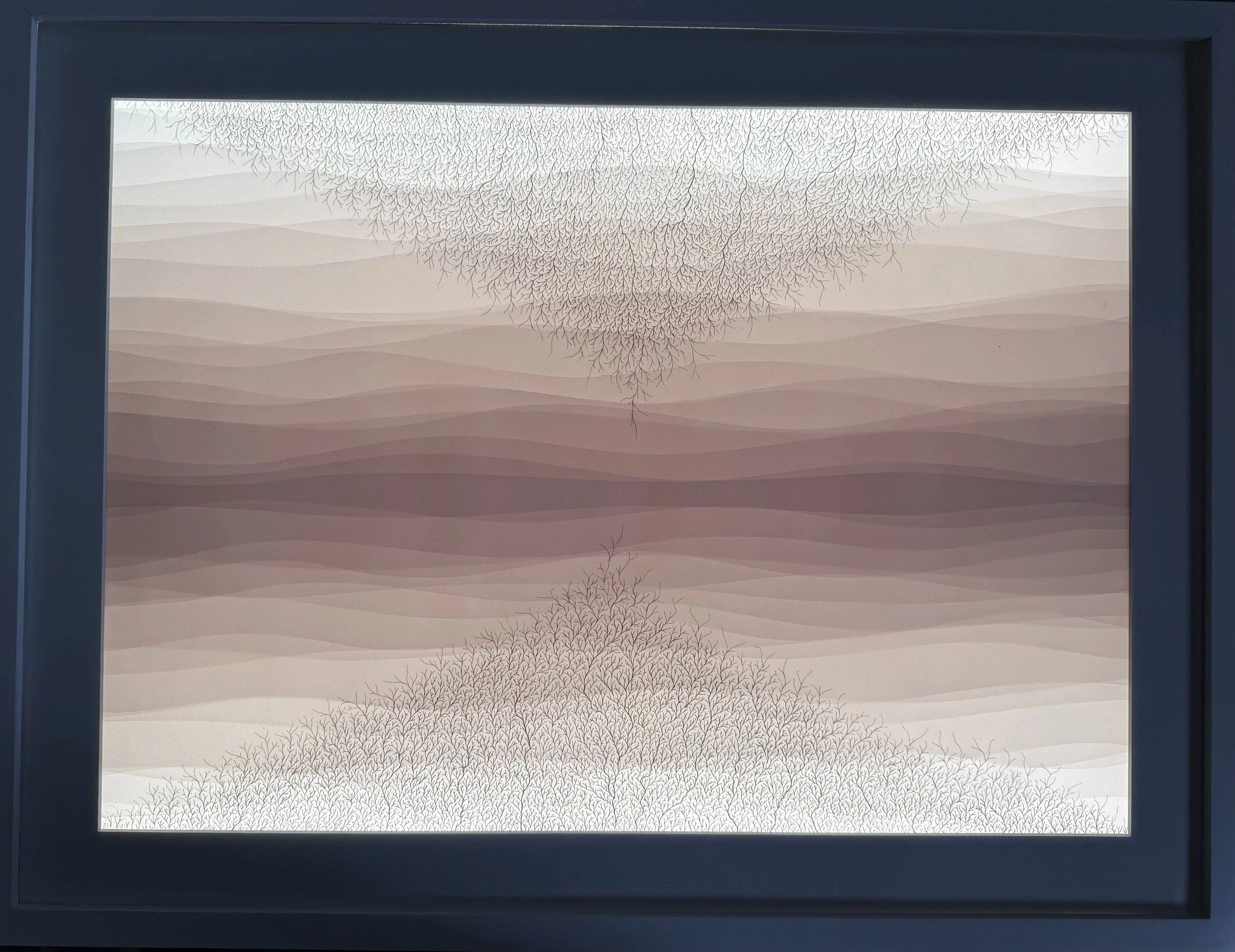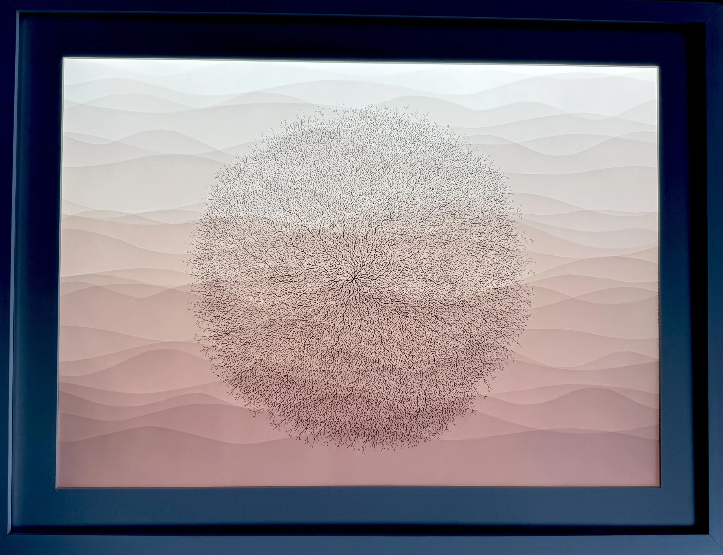 These mycelial networks of sustenance and communication closely mirror the neural networks of the human brain. Layered vellum symbolizes atmospheric perspective as physical and emotional distance. This series of lightboxes aims to invert the narrative paradigm, bringing both mycelium and our experience of loneliness to the surface—to uncover the unseen. Portraying mycelium as a symbol of resilience, these artworks address mental health, the importance of connection and complex kinship.